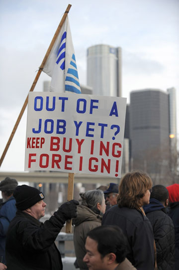 2009年1月11日,在美國底特律通用汽車公司(GM)總部附近,汽車工人手舉標(biāo)語,抗議購買外國汽車導(dǎo)致美國汽車業(yè)工人失業(yè)現(xiàn)象加劇。新華社/法新 |