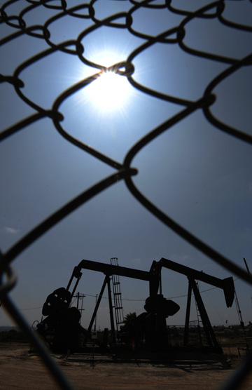 2009年5月12日在美國(guó)洛杉磯一個(gè)油田拍攝的工作中的機(jī)泵。新華社/法新 |