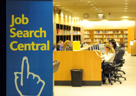 8日,在美國(guó)紐約公共圖書館設(shè)立的擇業(yè)信息中心內(nèi),求職者通過網(wǎng)絡(luò)瀏覽就業(yè)信息、填寫求職簡(jiǎn)歷。新華社記者:申宏