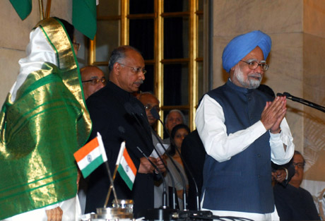 22日,在印度首都新德里,連任的印度總理曼莫漢·辛格(右一)宣誓就職。當日,以曼莫漢·辛格總理為首的新一屆印度政府在印度總統府正式宣誓就職。新華社發(fā) | 以總理辛格為首的印度新政府22日宣誓就職后,其內外政策走向成為印度國內外輿論關注的焦點。當地媒體普遍認為,繼續(xù)拉動本國經濟發(fā)展將是印度新政府各項工作的重中之重。 在印度新一屆政府中,前外交部長慕克吉出任財政部長,印度“硅谷”班加羅爾建造者之一、來自南方的前卡納塔克邦首席部長克里希納出任外交部長。慕克吉23日對媒體表示,保護印度經濟免受國際經濟衰退帶來的沖擊是新一屆政府的首要任務,同時新政府將采取措施激活本國經濟,保持經濟增長。克里希納在會見記者時表示,印度外交是為經濟發(fā)展服務的,印度政府的目標是在今后相當長的時間內保持經濟增長,做到這一點需要和平安寧的周邊環(huán)境和有利的國際環(huán)境。