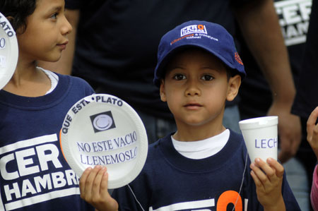 6月7日,在洪都拉斯首都特古西加爾巴,人們參加“零饑餓”大游行。當天,特古西加爾巴市市民以“零饑餓”為主題進行大規(guī)模游行,呼吁社會為消除饑餓和營養(yǎng)不良做出貢獻。據(jù)悉,由于國內糧食產量的持續(xù)下滑和中美洲糧食緊缺局面的加劇,目前洪都拉斯國內34座城市出現(xiàn)糧食供應問題,約有30萬名年齡在5歲以下的兒童營養(yǎng)不良,其中20萬營養(yǎng)不良兒童集中在相對貧瘠的洪都拉南部。目前,洪都拉斯政府正在尋求聯(lián)合國和中美洲鄰國的幫助,以求緩解國內日益嚴重的糧食危機。 |