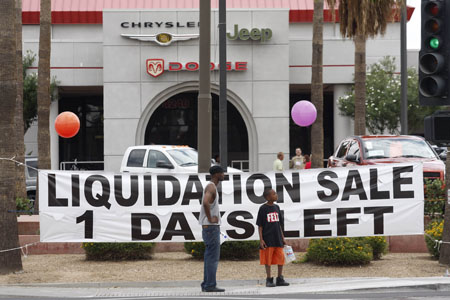 9日,美國(guó)亞利桑那州菲尼克斯市的一家克萊斯勒經(jīng)銷(xiāo)商辦事處外打出“清算銷(xiāo)售僅剩一天”的橫幅。新華社/路透 |