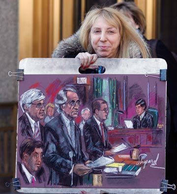 圖為畫家描繪的3月份伯納德·麥道夫受審圖。(資料照片) |