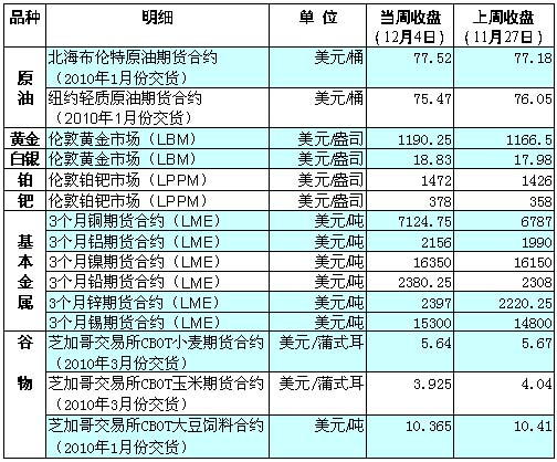 繼1日突破新“天花板”——每盎司1200美元大關(guān)后,倫敦市場(chǎng)金價(jià)3日再創(chuàng)新高,盤(pán)中升至1226.56美元。 在美元疲軟、通脹擔(dān)憂(yōu)增加和各國(guó)央行普遍增加黃金儲(chǔ)備的背景下,國(guó)際金價(jià)近期節(jié)節(jié)攀升、連創(chuàng)新高。分析人士認(rèn)為,從目前看來(lái),國(guó)際金價(jià)中期上行的動(dòng)力依然存在,短期回調(diào)不足以影響總體走強(qiáng)格局。高盛當(dāng)周發(fā)布報(bào)告,將其對(duì)未來(lái)12個(gè)月的金價(jià)預(yù)測(cè)值提高至每盎司1350美元,并預(yù)計(jì)明年黃金均價(jià)為1265美元。 金價(jià)持續(xù)攀升拉動(dòng)其他貴金屬價(jià)格走高。當(dāng)周,倫敦市場(chǎng)白銀期貨價(jià)創(chuàng)下16個(gè)月來(lái)新高,達(dá)到每盎司19.46美元,鉑和鈀的期貨價(jià)分別創(chuàng)下15個(gè)月和16個(gè)月新高。 受到美國(guó)商業(yè)能源庫(kù)存高企、需求不振等因素的壓制,當(dāng)周?chē)?guó)際油價(jià)在前兩個(gè)交易日小幅上漲后持續(xù)下跌。此外,根據(jù)美國(guó)勞工部公布的最新就業(yè)報(bào)告,11月份美國(guó)失業(yè)率意外下降至10%,顯示經(jīng)濟(jì)出現(xiàn)實(shí)質(zhì)性好轉(zhuǎn)。然而,由于投資者擔(dān)心經(jīng)濟(jì)的好轉(zhuǎn)會(huì)促使美聯(lián)儲(chǔ)提前加息,美元隨即受到追捧,從而拖累油價(jià)最終走低。因美國(guó)和中國(guó)制造業(yè)數(shù)據(jù)表現(xiàn)強(qiáng)勁,同時(shí)美元疲軟吸引了更多的投資資金進(jìn)入市場(chǎng),倫敦市場(chǎng)銅期貨價(jià)當(dāng)周大幅上漲,2日盤(pán)中攀升至每噸7170美元,為去年9月以來(lái)最高。 其他基本金屬期貨價(jià)格也呈現(xiàn)不同程度漲幅,分析人士認(rèn)為,這主要是因?yàn)槿蚝暧^經(jīng)濟(jì)形勢(shì)基本面向好,對(duì)金屬的需求總體看漲。數(shù)據(jù)顯示,美國(guó)11月份失業(yè)人口只增加1.1萬(wàn),是本次危機(jī)開(kāi)始以來(lái)表現(xiàn)最好的月份。另外,投資者相信經(jīng)濟(jì)合作與發(fā)展組織成員(OECD)對(duì)金屬的需求將會(huì)反彈,從而支撐金屬價(jià)格的上漲勢(shì)頭。 在基本面消息乏善可陳的情況下,外部市場(chǎng)主導(dǎo)了芝加哥市場(chǎng)農(nóng)產(chǎn)品期貨的價(jià)格走勢(shì)。當(dāng)周美元匯率的大幅上漲壓低了國(guó)際買(mǎi)家對(duì)美國(guó)農(nóng)產(chǎn)品的興趣,大豆、玉米和小麥的期貨價(jià)均較上周有所回落。