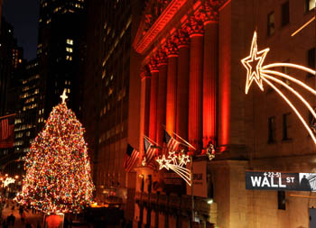 圣誕樹(shù)、霓虹彩燈等圣誕景觀給美國(guó)紐約華爾街帶來(lái)濃濃的節(jié)日氛圍。新華社記者 申宏