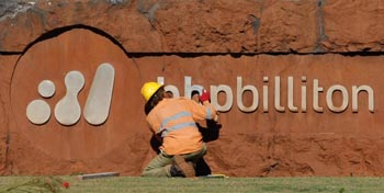 在澳大利亞的黑德蘭港,一名男子修理必和必拓公司的標志。新華社/路透 |