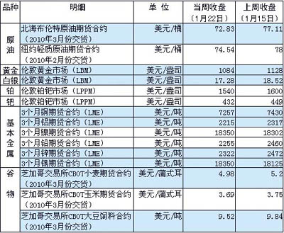 由于市場(chǎng)普遍擔(dān)心中國(guó)有可能采取措施控制經(jīng)濟(jì)增速,當(dāng)周多數(shù)大宗商品價(jià)格下跌。 當(dāng)周國(guó)際油價(jià)受美國(guó)股市暴跌拖累,延續(xù)了上一周的低迷而走低。國(guó)際油價(jià)跌破每桶75美元。紐約股市連續(xù)三天大幅下挫,道瓊斯指數(shù)創(chuàng)下了2009年3月以來(lái)的最大單周跌幅,對(duì)油市形成壓力。同時(shí),投資者擔(dān)心奧巴馬政府針對(duì)大型金融機(jī)構(gòu)的監(jiān)管措施會(huì)波及能源期貨市場(chǎng)。供求基本面上也缺乏能夠推高油價(jià)的因素。美國(guó)能源部公布的最新庫(kù)存報(bào)告顯示,過(guò)去四周內(nèi)美國(guó)燃油平均日需求量比去年同期下降了1.8%。 投資者近日對(duì)風(fēng)險(xiǎn)資產(chǎn)偏好的減弱,抑制了黃金的走勢(shì)。分析人士認(rèn)為,盡管黃金長(zhǎng)期來(lái)看具有保值避險(xiǎn)屬性,但在其價(jià)格大幅上漲之后,近期黃金的風(fēng)險(xiǎn)資產(chǎn)屬性更為明顯。此外,美國(guó)總統(tǒng)奧巴馬周中表示將加強(qiáng)對(duì)美國(guó)大型銀行的監(jiān)管,不再允許銀行擁有、資助或投資用于自營(yíng)盈利性的對(duì)沖基金,這令投資者擔(dān)心銀行的黃金投資可能遭到限制。同時(shí),美元近期的走強(qiáng)也壓制了以石油和黃金為代表的大宗商品價(jià)格。 當(dāng)周,鉛是價(jià)格下跌最大的金屬。國(guó)際鉛鋅研究組織公布的數(shù)據(jù)顯示,2009年前11個(gè)月全球鉛市場(chǎng)供應(yīng)過(guò)剩5.8萬(wàn)噸。該組織公布的數(shù)據(jù)還顯示,2009年前11個(gè)月全球鋅市場(chǎng)存在42.4萬(wàn)噸的過(guò)剩,而上年11月份鋅供應(yīng)量同比增加了7.4%,連續(xù)兩個(gè)月上升。當(dāng)月全球鋅的消費(fèi)量也同比上升了5.3%,創(chuàng)下兩年來(lái)最大增幅,這主要是由于中國(guó)和美國(guó)的鋅消費(fèi)改善引起的。 此前受美國(guó)農(nóng)業(yè)部大幅上調(diào)產(chǎn)量預(yù)估等因素影響,玉米、大豆和小麥連續(xù)走低,累計(jì)跌幅均在10%以上,由于技術(shù)性的超跌反彈,當(dāng)周略有企穩(wěn)。市場(chǎng)對(duì)中國(guó)大豆進(jìn)口減少的憂慮情緒有所緩和。小麥供給方面略有利好。國(guó)際谷物理事會(huì)周中表示,2010年全球小麥產(chǎn)量預(yù)估下降至6.53億噸,比上次預(yù)估減少2100萬(wàn)噸。
