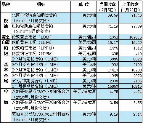 當(dāng)周國(guó)際油價(jià)先揚(yáng)后抑。當(dāng)周前兩個(gè)交易日,強(qiáng)勁的美國(guó)制造業(yè)數(shù)據(jù)提振了有關(guān)原油需求前景的預(yù)期,尼日利亞一條輸油管道被毀的消息則使投資者對(duì)該地區(qū)原油生產(chǎn)感到擔(dān)憂,這些因素導(dǎo)致油價(jià)大幅上漲。之后公布的數(shù)據(jù)顯示,美國(guó)原油庫(kù)存增長(zhǎng)超預(yù)期、美國(guó)就業(yè)數(shù)據(jù)疲軟,再加上美元走強(qiáng)因素的影響,國(guó)際油價(jià)因此又連續(xù)3個(gè)交易日回落。 令投資者失望的美國(guó)就業(yè)報(bào)告和歐洲主權(quán)債務(wù)危機(jī)的蔓延刺激投資者拋售股票和大宗商品等高風(fēng)險(xiǎn)資產(chǎn),并涌入美元市場(chǎng)尋求避險(xiǎn),避險(xiǎn)買盤(pán)推動(dòng)美元匯率大幅上漲,強(qiáng)勢(shì)美元壓制了投資者買入黃金以對(duì)沖美元貶值風(fēng)險(xiǎn)的需求,黃金期價(jià)因而走低。其他貴金屬價(jià)格也各有不同程度的下滑。 當(dāng)周倫敦市場(chǎng)基本金屬價(jià)格普遍下跌。擁有全球最大銅儲(chǔ)量的秘魯南方銅業(yè)公司日前宣布,今年將投資6億美元擴(kuò)大生產(chǎn)能力。另外,渣打銀行預(yù)測(cè)今年贊比亞銅產(chǎn)量將超過(guò)70萬(wàn)噸,將創(chuàng)40年來(lái)的新高;ㄆ煦y行最新發(fā)布的一份報(bào)告警告說(shuō),近期除中國(guó)之外地區(qū)的金屬消費(fèi)仍維持弱勢(shì),經(jīng)合組織國(guó)家的需求低迷,在龐大的庫(kù)存下,銅和鎳的價(jià)格面臨壓力。 當(dāng)周芝加哥農(nóng)產(chǎn)品期貨價(jià)格變動(dòng)不大。美國(guó)農(nóng)業(yè)部當(dāng)周進(jìn)行的非正式預(yù)估預(yù)計(jì),今年美國(guó)小麥種植面積將為5500萬(wàn)英畝,產(chǎn)量為20億蒲式耳,比2009年有所下降。這為小麥的價(jià)格上漲提供了一定支撐。而全球最大的小麥進(jìn)口國(guó)埃及有關(guān)方面表示,該國(guó)從俄羅斯、哈薩克斯坦和法國(guó)買入了24萬(wàn)噸小麥,美國(guó)小麥再次遭遇冷落,這在一定程度上又打壓了小麥價(jià)格。
