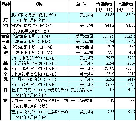倫敦市場基本金屬價格多數(shù)上揚(yáng),其中銅期貨價當(dāng)周一度升至每噸8010美元,為2008年8月初以來最高。分析人士指出,發(fā)達(dá)國家的采購經(jīng)理人指數(shù)今年以來延續(xù)擴(kuò)張之勢。此外,全球交易所基本金屬庫存近期由持續(xù)增長轉(zhuǎn)為高位回落,這成為金屬價格短期快速上漲的又一支撐。 國際油價當(dāng)周先揚(yáng)后抑。受投資者對經(jīng)濟(jì)復(fù)蘇和能源需求前景樂觀預(yù)期的推動,國際油價在當(dāng)周前兩個交易日接連上漲。其中,紐約市場油價6日盤中一度漲至每桶87.09美元,這是自2008年10月初以來油價首度突破87美元關(guān)口。此后,在美元走強(qiáng)、美國原油商業(yè)庫存連續(xù)第十周增加和獲利回吐等因素的共同作用下,國際油價連續(xù)三天出現(xiàn)下滑,紐約市場油價9日跌至每桶85美元之下。 倫敦市場金價9日觸及每盎司1160.03美元的高位,為今年1月11日以來最高。分析人士指出,實(shí)物需求、通脹壓力及主權(quán)債務(wù)問題等因素正推動金價上漲。目前,國際金價離年內(nèi)高點(diǎn)1164美元只有一步之遙,且在整個基本面支持下,金價易漲難跌。不過,獲利回吐和美元走強(qiáng),短期內(nèi)可能限制金價上行空間。 芝加哥小麥期貨價當(dāng)周呈波幅震蕩走勢。分析人士稱,全球小麥巨大的供應(yīng)量以及美國產(chǎn)糧區(qū)未來數(shù)日的良好天氣將繼續(xù)打壓小麥價格走低。美國大部分玉米種植地區(qū)溫暖干燥的天氣將持續(xù)到下周。