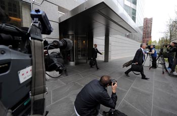 4月16日,在美國紐約曼哈頓,記者在高盛集團總部外采訪。當日,美國證券交易委員會向紐約曼哈頓聯(lián)邦法院提起民事訴訟,指控高盛集團在涉及次級抵押貸款業(yè)務(wù)金融產(chǎn)品問題上涉嫌欺詐投資者。新華社記者 申宏 攝