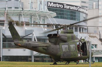 在加拿大城市多倫多,一架軍用直升機在G20峰會會場附近草坪上等待執(zhí)行巡邏任務(wù)。新華社發(fā)(鄒崢