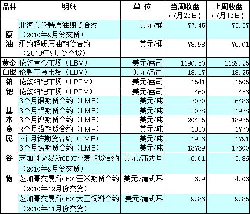受到美國上市公司良好業(yè)績、美元走低以及熱帶風暴可能襲擊墨西哥灣等因素刺激,紐約市場油價再次逼近每桶80美元關(guān)口。倫敦市場金價也回升至每盎司1200美元附近。 卡特彼勒、聯(lián)合包裹公司以及美國電話電報公司等一系列美國大公司相繼公布的二季度業(yè)績均好于預(yù)期,多數(shù)公司還調(diào)高了對全年的盈利預(yù)期,這增強了市場投資者的信心。 同時,歐洲公布的經(jīng)濟數(shù)據(jù)顯示歐元區(qū)經(jīng)濟增長情況好于預(yù)期,這促使歐元對美元匯率走強。上述樂觀經(jīng)濟數(shù)據(jù)均對大宗商品市場起到了明顯的支撐作用。 由于一些美國公司財報令投資者感到鼓舞,且歐洲和亞洲股市多數(shù)上漲,同時美元對主要西方貨幣出現(xiàn)了不同程度的下跌,倫敦市場基本金屬價格也全線上漲。當周鉛期貨價上漲10%,錫期貨價上漲6.7%,鎳和鋅期貨價均上漲7.5%。 芝加哥農(nóng)產(chǎn)品期價漲跌不一。受到天氣因素和外部市場的影響,芝加哥期貨交易所玉米期價跌勢明顯。盡管目前美國中西部天氣炎熱,但近期大量降雨緩解了高溫天氣給玉米作物帶來的影響,提振其豐產(chǎn)預(yù)期。 在投資者關(guān)于炎熱干燥天氣將進一步降低歐洲、俄羅斯、哈薩克斯坦、加拿大等全球小麥主產(chǎn)區(qū)小麥產(chǎn)量的預(yù)期推動下,小麥期價進一步走高。7月份以來,芝加哥小麥期價已大幅攀升24%,并于22日觸及每盎司6.1美元的2009年6月以來的高點。 美國農(nóng)業(yè)部23日公布的數(shù)據(jù)顯示,美國私人出口商向中國售出將于2010至2011市場年交割的17.55萬噸大豆,而上周大豆凈出口銷售量遠遠高于預(yù)期,顯示出美國大豆出口銷售步伐十分強勁。此外,天氣預(yù)報顯示,自周末起一股炎熱氣流將橫掃美國中西部大豆種植帶的大部分地區(qū)。由于目前美國大豆已經(jīng)進入生長的關(guān)鍵時期,天氣因素的不確定性助推大豆期價上揚。
