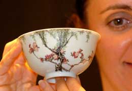 清乾隆御制琺瑯彩杏林春燕圖碗,估價(jià)逾6000萬(wàn)港元。 本報(bào)記者 黃本強(qiáng) 攝