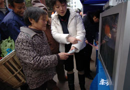 隨著重慶市新農(nóng)村建設(shè)的不斷推進和農(nóng)村文化服務(wù)水平的提高,重慶市大渡口區(qū)拱橋村已成為該市第一批開通數(shù)字電視的村莊之一。圖為2006年12月25日,重慶市大渡口區(qū)的數(shù)字電視服務(wù)人員在為拱橋村的村民們講解數(shù)字電視的收看方法。新華社記者:楊磊