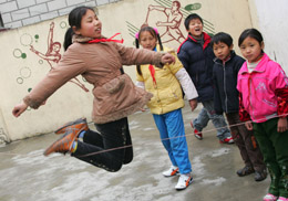 3月16日,惠民中心學(xué)校四年級一班的陳敏(左)正和伙伴們在新操場上跳皮筋。 為確保農(nóng)民工子女學(xué)校師生安全和健康,上海市教委近日出臺專門文件,以專項經(jīng)費支持形式,重點改善農(nóng)民工子女學(xué)校教室照明以及食堂、廁所等基本設(shè)施設(shè)備,進一步優(yōu)化校園環(huán)境。到今年8月31日之前,277所農(nóng)民工子女學(xué)校辦學(xué)條件將大大改善,滬上18萬農(nóng)民工子女將擁有更好的求學(xué)環(huán)境。 |