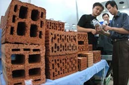 南京一家新型建筑材料公司在展示該公司利用頁(yè)巖和尾礦等礦山廢棄物開(kāi)發(fā)研制的各種節(jié)能墻磚。(本報(bào)資料照片) |