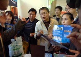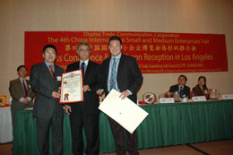 “融資難”是制約中小企業(yè)發(fā)展的首要問題。越來越多關(guān)于中小企業(yè)的展會,都把融資作為主要內(nèi)容。上圖為幾名觀眾在第四屆中國中小投資項目創(chuàng)洽會軍博開幕了解一個投資項目的詳細情況。下圖為在中國國際中小企業(yè)博覽會(中博會)在洛杉磯舉行的推介會上,加州議會議員趙美心的代表特里(中)在向中國國際貿(mào)易促進委員會廣東省分會副會長白明韶(左一)頒發(fā)賀狀。(本報資料照片) |