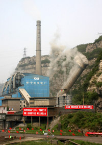 6月5日,山西省政府在陽泉市實施了對中國電力投資集團娘子關(guān)發(fā)電廠發(fā)電機組拆除活動。圖為娘子關(guān)發(fā)電廠的煙囪正在倒塌。