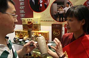 | 6月6日首屆山西品牌節(jié)在太原舉行,當(dāng)日,有141件自主商標(biāo)參展,其中馳名商標(biāo)14件,山西省著名商標(biāo)127件。工作人員(右)在向參觀者介紹山西千年老陳醋品牌。新華社發(fā)