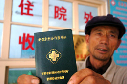 2007年,新型農(nóng)村合作醫(yī)療制度已經(jīng)覆蓋甘肅全省所有農(nóng)村人口,參合人數(shù)達(dá)到1780萬(wàn)人。圖為甘肅省白銀市平川區(qū)水泉鎮(zhèn)下村農(nóng)民白江正在展示自家的“新型農(nóng)村合作醫(yī)療證”。新華社記者:張錳