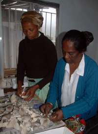 南非農(nóng)村婦女們10月4日正在南非東南部祖魯王國山區(qū)夸丁迪村包裝加工自己種植的蘑菇。 福建農(nóng)林大學的中國菌草蘑菇專家林占熺教授2005年1月把菌草蘑菇栽培技術和旱稻技術引入祖魯王國,在窮山溝建立五萬平方米的蘑菇基地,與村民一起建起了1500平方米的蘑菇大棚。目前正在建設工廠化的蘑菇菌袋車間,其規(guī)模為年產(chǎn)100萬袋,產(chǎn)值達1000萬蘭特(約145萬美元),為450人提供就業(yè)機會。 |