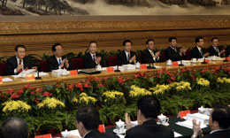 10月17日,中國共產(chǎn)黨第十七次全國代表大會主席團在北京人民大會堂舉行第二次會議。胡錦濤、吳邦國、溫家寶、賈慶林、曾慶紅、吳官正、李長春、羅干等出席會議。 新華社記者:蘭紅光