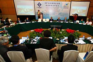 | 11月9日,2007歐亞經(jīng)濟(jì)論壇代表在教育合作會(huì)議上發(fā)言。當(dāng)日,2007歐亞經(jīng)濟(jì)論壇在西安舉行能源、旅游、教育、金融領(lǐng)域合作會(huì)議和各國(guó)投資環(huán)境推介會(huì)議,架起歐亞各國(guó)相互合作、共同發(fā)展的橋梁。新華社發(fā)(侯智