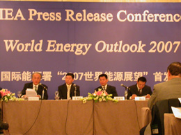 《世界能源展望2007》中國首發(fā)式現(xiàn)場。 | “中國有可能給世界帶來前所未有的能源機遇,參與全球治理已成為中國能源戰(zhàn)略的必然選擇!鼻迦A大學國情研究中心主任胡鞍鋼教授說,“中國和印度的崛起,不僅改變了世界經(jīng)濟和貿(mào)易的格局,也改變了世界能源格局,中國和印度所面臨的能源挑戰(zhàn)也就是全球的挑戰(zhàn)。” 胡鞍鋼教授是在11月9日國際能源署(IEA)舉行的《世界能源展望2007》中國首發(fā)式上做上述表示的。
