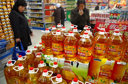 顧客正在銀川一家超市內(nèi)挑選食用油。目前受原料價(jià)格上漲因素影響,銀川市場(chǎng)各種品牌的食用油零售價(jià)格全線上浮,5升標(biāo)準(zhǔn)桶裝較一月前平均漲5至10元。新華社記者:李紫恒