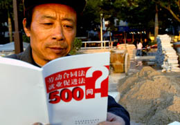 1月1日,來自四川渠縣的外來工肖光明在福州街頭工作休息時閱讀勞動合同法的相關(guān)問答。當(dāng)日,《中華人民共和國勞動合同法》正式施行。