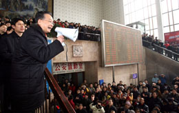 1月29日,溫家寶總理在湖南長沙火車站看望滯留車站的旅客。溫家寶對(duì)旅客說,春節(jié)快到了,我給大家拜個(gè)早年。你們被困在火車站,還沒能提早回家,我表示深深的歉意,現(xiàn)在我們正在想盡一切辦法搶修,一定把大家送回家過春節(jié)。新華社記者:姚大偉