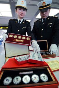 近日,沈陽(yáng)海關(guān)在沈陽(yáng)桃仙國(guó)際機(jī)場(chǎng)空港口岸連續(xù)查獲兩起涉嫌侵犯北京奧運(yùn)會(huì)奧林匹克知識(shí)產(chǎn)權(quán)案件,共查獲涉嫌侵權(quán)的鑰匙鏈120個(gè)、紀(jì)念幣22套和若干紀(jì)念郵票等物品。圖為海關(guān)工作人員在清理查獲的涉嫌侵犯北京奧運(yùn)會(huì)奧林匹克知識(shí)產(chǎn)權(quán)的物品。