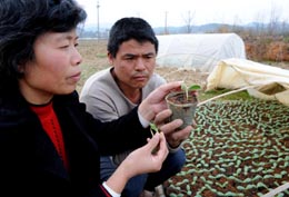 3月12日,高級(jí)農(nóng)藝師姚源瓊(左)在福建省建陽(yáng)市徐市鎮(zhèn)田間為農(nóng)戶會(huì)診瓜苗病蟲害。 新華社記者:張國(guó)俊