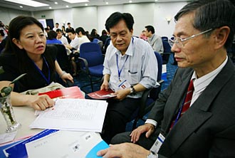| 4月9日,臺灣商人劉秋男(右一)在與大陸企業(yè)代表洽談。當(dāng)日,第二屆海峽兩岸投資貿(mào)易對接會在廈門開幕。新華社記者 魏培全
