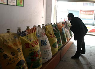 | 去年底以來,湖北農(nóng)村市場化肥價格大幅上漲。圖為一位物價管理人員在湖北監(jiān)利縣一農(nóng)資配送點查看化肥市場價格情況。新華社記者