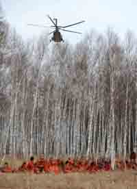 武警內(nèi)蒙古大興安嶺森林支隊(duì)官兵在撲火前線(4月20日攝)。 4月16日,內(nèi)蒙古大興安嶺畢拉河、烏爾旗漢發(fā)生森林大火,分為4個(gè)火場(chǎng)。經(jīng)過(guò)4晝夜奮力撲救,到4月20日8時(shí),經(jīng)飛機(jī)巡視所有火場(chǎng),并綜合各火場(chǎng)情況報(bào)告,整個(gè)火場(chǎng)外線明火全部撲滅;饒(chǎng)進(jìn)入全面清理階段。 |