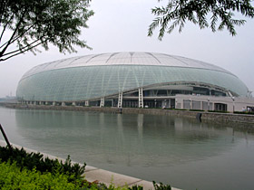 2008年北京奧運(yùn)會(huì)計(jì)劃使用比賽場(chǎng)館37個(gè),其中北京地區(qū)32個(gè)。天津奧林匹克中心體育場(chǎng)便是五個(gè)京外地區(qū)比賽場(chǎng)館之一,也是所有奧運(yùn)會(huì)新建場(chǎng)館中最早建設(shè)的項(xiàng)目。在綠色奧運(yùn)的理念指導(dǎo)下,天津奧林匹克中心體育場(chǎng)在建設(shè)中時(shí)刻把保護(hù)生態(tài)環(huán)境放在第一位。 由于天津奧林匹克中心體育場(chǎng)的外形酷似從天而降的一滴水,天津人形象地稱之為“水滴”。遠(yuǎn)遠(yuǎn)望去,陽光下的“水滴”明亮奪目,其銀色的“外衣”十分搶眼。據(jù)天津體育局副局長(zhǎng)謝德龍介紹,“水滴”采用了聚碳酸酯板材智能化屋面系統(tǒng),具有很高的透光率及重量輕、抗沖擊、隔熱、防結(jié)露、節(jié)能等特點(diǎn),與相同厚度的傳統(tǒng)板材相比,可節(jié)省25%的能源! 與其他體育場(chǎng)不同的是,“水滴”四面被一汪碧水所包圍,它的東、西、南、北方向是四個(gè)人工湖,湖上的四條坡道就像是四座人行天橋,有帶頂棚的長(zhǎng)長(zhǎng)走廊和連接地面的臺(tái)階,能將人們直接“輸送”到位于半空中的“水滴”觀光平臺(tái)。記者了解到,體育場(chǎng)在規(guī)劃之初,就本著因地制宜的宗旨,充分利用天津市區(qū)西南部地勢(shì)低洼的地形特點(diǎn),進(jìn)一步挖掘周圍洼地建成了這座“水中體育場(chǎng)”,這樣一來不僅可以提高水質(zhì)、減少建筑揚(yáng)塵,還形成了獨(dú)特的水體景觀,體現(xiàn)了天津市依水而生的人文歷史和自然環(huán)境特征! 在臨近體育場(chǎng)活動(dòng)區(qū)的一側(cè),為了方便管理和與建筑景觀相協(xié)調(diào),建筑師采用了人工駁岸,而在遠(yuǎn)離體育場(chǎng)的一側(cè),為了保護(hù)水體和生物多樣性,這里選用了模仿自然駁岸的處理方法,水里還養(yǎng)殖了多種魚類,既凈化了水體,又充滿了生機(jī)和活力。 進(jìn)入體育場(chǎng),給記者的第一感覺是一片藍(lán)色,如果說“鳥巢”的中國紅帶給人熾烈、激動(dòng)、振奮,而“水滴”帶給記者的則是安逸、平靜。在觀眾席上,六萬個(gè)以蔚藍(lán)色為主的坐椅,像海浪一樣環(huán)繞著整個(gè)場(chǎng)館。這象征著天津人的母親河——海河。