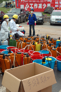 這是位于綿竹市東方汽輪機廠內的消毒防疫點(5月15日攝)。 四川省綿竹市災區(qū)為防止疫情爆發(fā),開始對居民聚集點等重點區(qū)域展開消毒和防疫工作。新華社記者:苑堅