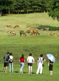 昔日地廣人稀、寒冷原始的“北大荒”,如今隨著各類天然而充滿特色的旅游項(xiàng)目開(kāi)發(fā),正在成為中國(guó)新的旅游勝地。圖為游客們?cè)谝链菏幸粋(gè)天然鹿場(chǎng)觀賞鹿群。 |