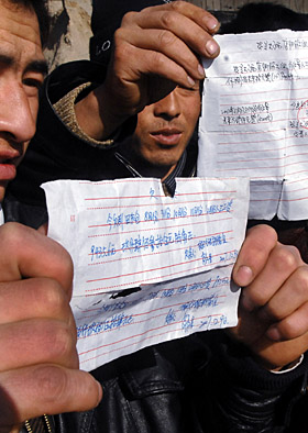 | 近年來,企業(yè)職工收入分配“強(qiáng)資本、弱勞工”的狀態(tài)十分突出,因而民工欠薪問題屢屢出現(xiàn)。圖為幾位農(nóng)民工正在出示他們的欠款“白條”。新華社記者