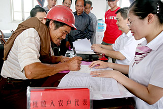 | 瑞安市農(nóng)業(yè)合作銀行的工作人員為農(nóng)戶辦理貸款手續(xù),首批12戶低收入農(nóng)戶得到了23.8萬元的無息創(chuàng)業(yè)貸款。(資料照片) | 如何解決貧困農(nóng)民融資難,貧困地區(qū)一直苦無良策。近年寧夏回族自治區(qū)在部分貧困鄉(xiāng)村探索建立村級發(fā)展互助資金,各級財政先期無償注入資本金,通過農(nóng)戶自愿入股方式吸收聚集民間資本,以小額信貸方式有償發(fā)放,既緩解了貧困農(nóng)戶發(fā)展生產(chǎn)資金短缺的問題,又創(chuàng)新了財政扶貧資金的使用和管理方式。 寧夏扶貧辦副主任馬崇林向記者算了一筆賬,農(nóng)民使用互助資金需支付占用費,支付率低于同期農(nóng)村信用社小額支農(nóng)貸款利率。年終決算,占用費收入的40%滾入本金,60%用于分紅和提取管理費用。如果能夠形成良性循環(huán),可以利用的資金將會越來越多,互助金也將成為更多貧困農(nóng)民的“草根銀行”。