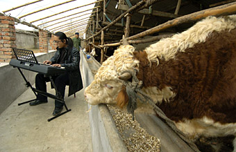 “禿頭,乖,別動(dòng)”,劉海川一邊梳毛,一邊不停地給禿頭說(shuō)話。禿頭是劉海川養(yǎng)牛場(chǎng)的一頭牛,因?yàn)闆](méi)長(zhǎng)角,被他稱作禿頭。與禿頭一樣,這里的幾十頭牛都有自己的名字,“我都把它們當(dāng)成自己的孩子,時(shí)間長(zhǎng)了一喊名字,它們就有反應(yīng)”,劉海川說(shuō)。 劉海川的養(yǎng)牛場(chǎng)不大,但很特別,每個(gè)牛圈都安裝了音箱,這讓禿頭和其它幾十頭牛每天能聽到美妙的鋼琴曲。每當(dāng)《梁!返葍(yōu)美的曲子響起,這些牛變得溫順,用劉海川的話說(shuō)“牛脾氣不見了,好管理了”。 2007年5月開辦養(yǎng)牛場(chǎng)后,劉海川遇到過(guò)問(wèn)題,但勤奮好學(xué)的他每次都能找到解決辦法。 一次偶然的機(jī)會(huì),長(zhǎng)時(shí)間不彈鋼琴感覺技癢的劉海川在養(yǎng)牛場(chǎng)彈鋼琴,彈著彈著,他發(fā)現(xiàn)聽到琴聲后,安靜的牛群有了動(dòng)靜。伴隨著激昂或柔美的琴聲,牛群時(shí)而狂躁,時(shí)而悠閑。 查閱大量資料后,劉海川發(fā)現(xiàn),在國(guó)外早就有飼養(yǎng)員給牛聽音樂(lè)的事例。從那以后,每逢晴天,劉海川就把鋼琴搬到院里,給牛彈各種柔美的曲子。天氣變冷,劉海川擔(dān)心鋼琴長(zhǎng)時(shí)間在戶外不利于保養(yǎng),就在各個(gè)牛圈里裝上音箱,每天定時(shí)給牛群播放鋼琴曲。 一段時(shí)間后,“對(duì)牛彈琴”不僅使牛聽話了,牛肉也變得更好吃了。不少客戶品嘗了劉海川的牛肉后,表示味道鮮美,F(xiàn)在,劉海川養(yǎng)的牛銷路好,每批牛都提前接到訂單,價(jià)格也不錯(cuò)。