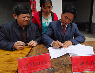 | 2008年3月20日,農(nóng)戶胡廣輝(右)與江西先農(nóng)種子公司、中糧米業(yè)等6家單位簽下合同書,使自己的糧食生產(chǎn)從播種到收獲加工再到銷售等各個環(huán)節(jié)得到相應(yīng)保障。胡廣輝承包水田9000畝,年產(chǎn)稻谷550萬公斤,在2007年獲得“全國糧食生產(chǎn)大戶”榮譽(yù)稱號。 |