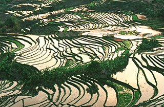 | 中國用占世界7%左右的耕地,養(yǎng)活了占世界22%的人口。云南省多山地丘陵,當(dāng)?shù)馗髯迦嗣駥⑸狡麻_墾成小塊農(nóng)田,種植水稻,增加糧食生產(chǎn)。 | 多年前,一位國外學(xué)者發(fā)出“中國人能否養(yǎng)活自己”的疑問,讓世界為中國的糧食生產(chǎn)擔(dān)憂。而今天,中國完全可以憑自己糧食生產(chǎn)的成就向世界保證:中國完全有能力養(yǎng)活自己。中國連續(xù)5年的糧食豐收,在今年的世界糧食危機(jī)中國所表現(xiàn)出的平穩(wěn),都是很好的例證;仡櫢母镩_放30年,中國在糧食生產(chǎn)方面取得了令世界矚目的成就,使國人更加堅(jiān)信在糧食生產(chǎn)方面的能力。