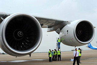 | 被譽為“空中巨無霸”的空客A380型客機在珠海機場參加今年的第七屆珠海航展。新華社記者 周文杰