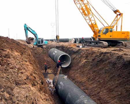 1月7日,在安徽省淮北市李槽坊站站場南側(cè),施工人員將最后一根管道吊裝入位。 當(dāng)日,全長89公里的“淮水北調(diào)”工程輸水管道全線貫通,并有望在春節(jié)前調(diào)試供水!盎此闭{(diào)”工程自淮河支流淮洪新河取水,出水口位于安徽省濉溪縣臨渙塌陷區(qū),工程建成后將緩解宿州、淮北兩市新增工業(yè)用水壓力并兼顧沿線農(nóng)業(yè)灌溉和生態(tài)用水。 |