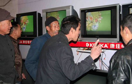 1月7日,湖南邵陽(yáng)幾位村民在家電下鄉(xiāng)銷售點(diǎn)選購(gòu)彩電。 春節(jié)臨近,湖南邵陽(yáng)縣啟動(dòng)“家電下鄉(xiāng)”活動(dòng),農(nóng)民購(gòu)買彩電、冰箱、手機(jī)、洗衣機(jī)都能享受產(chǎn)品銷售價(jià)格13%的財(cái)政補(bǔ)貼,有效地促進(jìn)了農(nóng)村節(jié)日消費(fèi)。新華社發(fā)(李愛民