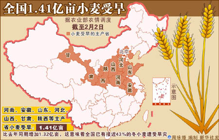 春節(jié)過(guò)后,小麥即將進(jìn)入返青期。為了打贏抗旱保苗奪豐收這場(chǎng)硬仗,河南提出要集中全力,在未來(lái)10天時(shí)間,把全省7000多萬(wàn)畝小麥再普遍澆灌一遍。 根據(jù)最新統(tǒng)計(jì),河南受旱面積已達(dá)到4519萬(wàn)畝,有50萬(wàn)畝麥田不同程度地出現(xiàn)麥苗枯死現(xiàn)象。從2008年10月24日到2009年2月1日,全省平均降水量?jī)H為10.7毫米,較常年同期減少近八成。為應(yīng)對(duì)持續(xù)發(fā)展的嚴(yán)重旱情,河南省防汛抗旱指揮部2月1日宣布,將原來(lái)的Ⅲ級(jí)抗旱應(yīng)急響應(yīng)升為Ⅱ級(jí)。當(dāng)前,麥田旱情持續(xù)發(fā)展,受旱面積之大,時(shí)間之長(zhǎng),程度之重,都為新中國(guó)成立以來(lái)所少有。 2日下午,河南再次召開抗旱澆麥奪豐收電視電話會(huì),對(duì)下一階段的抗旱澆麥工作作出部署:要爭(zhēng)取用10天時(shí)間,把全省7000多萬(wàn)畝小麥普遍澆灌一遍,堅(jiān)決打贏抗旱澆麥奪豐收的攻堅(jiān)戰(zhàn)。會(huì)議要求各級(jí)各部門要立即行動(dòng)起來(lái),有澆水條件的要加快進(jìn)度,做到早澆快澆;要搞好調(diào)查研究,澄清自流灌區(qū)、井灌區(qū)和水源條件缺乏的岡丘地區(qū)等不同地域的可灌面積、已灌面積,做到心中有數(shù)。對(duì)有水源但水利條件差的地方,要通過(guò)車?yán)藫?dān)等方式,爭(zhēng)取多澆一畝麥,多保一畝苗。同時(shí),對(duì)于國(guó)家和省級(jí)撥付的5億多元抗旱資金要用好,確保及時(shí)到位,而且要從本級(jí)財(cái)政中爭(zhēng)取多拿出一些資金,支持抗旱澆麥奪豐收工作,確?购禎阐湵XS收的資金需要。必要時(shí),動(dòng)員組織機(jī)關(guān)、工礦企業(yè)、抗旱服務(wù)隊(duì)、部隊(duì)為缺水群眾送水,確保旱區(qū)群眾基本生活用水需要。