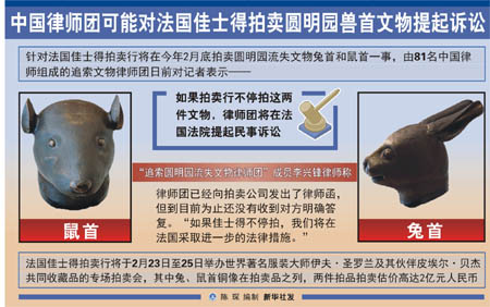 針對(duì)法國(guó)佳士得拍賣(mài)行將在今年2月底拍賣(mài)圓明園流失文物兔首和鼠首一事,由81名中國(guó)律師組成的追索文物律師團(tuán)日前對(duì)記者表示,如果拍賣(mài)行不停拍這兩件文物,律師團(tuán)將在法國(guó)法院提起民事訴訟。 這個(gè)“追索圓明園流失文物律師團(tuán)”成員李興鋒律師說(shuō),律師團(tuán)已經(jīng)向拍賣(mài)公司發(fā)出了律師函,但到目前為止還沒(méi)有收到對(duì)方明確答復(fù)!叭绻咽康貌煌E,我們將在法國(guó)采取進(jìn)一步的法律措施。” 事實(shí)上,律師團(tuán)自今年1月成立以來(lái)在追索兔首和鼠首文物一事上可謂一波三折。起先,根據(jù)法國(guó)法律規(guī)定,原告需要與事實(shí)有利害關(guān)系,律師團(tuán)一直沒(méi)有找到合適的原告。等確定全球愛(ài)新覺(jué)羅家族宗親會(huì)為原告后,所涉及的高額訴訟費(fèi)以及法院審判需要支付的補(bǔ)償金又沒(méi)了著落。近日,一家房地產(chǎn)公司表示愿意出資40萬(wàn)元支持追索行動(dòng),律師團(tuán)的工作才得以繼續(xù)。 據(jù)了解,法國(guó)佳士得拍賣(mài)行將于2月23日至25日舉辦世界著名服裝大師伊夫·圣羅蘭及其伙伴皮埃爾·貝杰共同收藏品的專(zhuān)場(chǎng)拍賣(mài)會(huì),其中兔、鼠首銅像在拍賣(mài)品之列,兩件拍品拍賣(mài)估價(jià)高達(dá)2億元人民幣。 此前有報(bào)道稱(chēng)國(guó)家文物局博物館司司長(zhǎng)宋新潮表示反對(duì)回購(gòu)。他認(rèn)為既然是中國(guó)的東西,就沒(méi)有必要用中國(guó)的錢(qián)買(mǎi)回來(lái)。這兩件文物都是由于戰(zhàn)爭(zhēng)原因被掠奪到海外的文物,根據(jù)國(guó)際公約,要在道義上進(jìn)行呼吁和追溯,希望其返還。對(duì)于追回方式,他首先不希望通過(guò)拍賣(mài),其次要尊重收藏家意愿,通過(guò)相應(yīng)的補(bǔ)償以回贈(zèng)方式追回,同時(shí)也歡迎和鼓勵(lì)通過(guò)捐贈(zèng)的方式促成回歸。 李興鋒說(shuō):“不管這次追索結(jié)果如何,現(xiàn)在可以看到中國(guó)公眾對(duì)這件事的強(qiáng)烈關(guān)注,激起了人們通過(guò)法律手段實(shí)現(xiàn)保護(hù)國(guó)家財(cái)產(chǎn)的熱情和認(rèn)識(shí),這將為我們今后追索流失文物提供有利經(jīng)驗(yàn)!