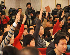 李肇星像個指揮家,從走進(jìn)水泄不通的十一屆全國人大二次會議新聞發(fā)布會現(xiàn)場,這位發(fā)言人的一舉一動都會引來“咔咔咔”一連串的快門聲。這位中國前外長妙語連珠,不時引起現(xiàn)場陣陣笑聲。原定一個小時的新聞發(fā)布會被一再延長,最后用了將近兩個小時。 艷麗的服飾、彩色筆記本、加長話筒和揮舞的報紙都成為記者們爭取提問機會的“工具”!澳膲夭婚_提哪壺”、“患難見真情”、“君子愛財、取之有道”……李肇星這些生動語言給在場的記者留下了深刻印象。 “我是邊干邊學(xué)!崩钫匦瞧届o地看待自己從外交部長到全國人大外事委員會主任委員角色的轉(zhuǎn)變,“人的職務(wù)總是會有變化的,對我來說不變的是,我是祖國的兒子、人民的服務(wù)員、朋友的朋友、知識面前的小學(xué)生。”他說。 確實,在整場發(fā)布會中,他還像是以前的那位敏銳犀利的外長,但是又似乎不止如此,還像一個友善的朋友、一個勤奮的學(xué)生。 在一張一弛中,會場的氣氛變得既緊張認(rèn)真,又輕松活躍。鳳凰衛(wèi)視一位短發(fā)美女記者站起身來,提出了節(jié)約辦會、會期縮短原因和地方為兩會代表發(fā)放補貼等一連串問題,李肇星聽完后側(cè)過頭去和坐在他右邊的新聞發(fā)布會主持人李連寧低聲交流了一下,兩人都笑了起來,他隨即正色道:“人大工作的特點是嚴(yán)格按照法律和法律程序辦事,剛才主持人已經(jīng)宣布,每位記者只提一個問題,可是您一共提了3個!痹趫龅挠浾哳D時感受到這位前外長的鋒芒,但是,話鋒一轉(zhuǎn),他又說,“在下不為例的前提下,我愿意回答你所有的問題!睅е鴿庵厣綎|口音的李肇星完全掌握了節(jié)奏。 他在新崗位上的學(xué)習(xí)成績看起來很不錯;卮鸸(jié)約辦兩會的問題時,他舉起了一個紅色的小本本告訴記者,《中華人民共和國憲法》中有“反對浪費”的規(guī)定,國宴都改革為三菜一湯,不上白酒了。后來,他又一次舉起了這本《中華人民共和國憲法》,托著腮說,“這一年多來,我學(xué)得最多的就是憲法!薄斑沁沁恰薄质且贿B串快門聲。 一位地方報紙的記者好不容易被點名,拿到話筒后顯得非常緊張,至少過了五秒鐘才意識到自己把話筒拿倒了,這把在場的記者都逗樂了,他的臉也漲得通紅。李肇星笑著對他說:“不要緊張嘛!”在新聞發(fā)布會結(jié)束時,李肇星還不忘對身邊的翻譯孫寧表示感謝,主席臺上并沒有這位年輕小伙子的名字,沖著這份尊重,現(xiàn)場的記者給了李肇星一陣熱烈的掌聲。